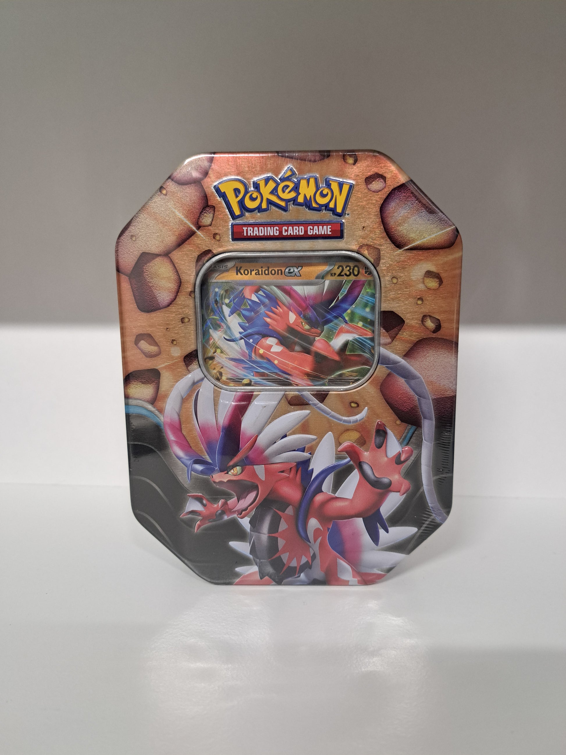 • Diese Tin-Box Schlagkräftige Legenden des Pokémon-Sammelkartenspiels enthält 1 holografische Promokarte mit Koraidon-ex und 4 Boosterpacks des Pokémon-Sammelkartenspiels.